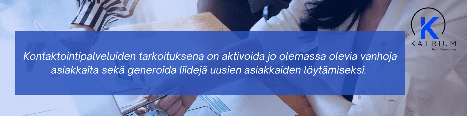 Kontaktointipalvelut pitävät sisällään muun muassa uusien liidien generoinnin eli uusien asiakkaiden löytämisen, yhteystietojen ja asiakastietojen päivityksen. Siihen kuuluu myös jo olemassa olevien vanhojen asiakkaiden aktivointi, joka tapahtuu niin sanotulla kylmäsoittamisella. Liidien generointi eli uusien asiakkaiden löytäminen on kokonaisuudessaan prosessi. Sen perimmäinen tarkoitus on kiinnittää mahdollisten uusien asiakkaiden huomio yrityksesi tarjoamiin palveluihin heille mahdollisimman kiinnostavalla tavalla. Mikäli kiinnostus palveluihin tai tuotteisiin saadaan herätettyä, voi kyseisestä henkilöstä tulla yrityksesi uusi luottoasiakas. Yhteystietojen ja asiakastietojen päivityksellä taas tarkoitetaan niin vanhojen asiakkaiden yhteystietojen päivittämistä, mutta myös uusien potentiaalisten kuluttajien yhteystietojen etsimistä. Kylmäsoittaminen on nimensä mukainen termi, jolla tarkoitetaan sitä, että ns. “kylmälle” asiakkaalle tai kontaktille eli sellaiselle, joka ei ole ilmaissut sen kummempaa kiinnostusta tuotteista tai palveluista, soitetaan ja tarjotaan yritiyksesi tuotteta ja palveluita. Ajatuksena on pyrkiä samaan muun muassa jo yrityksesi tuotteita tai palveluita ostaneet ja tilanneet asiakkaat kiinnostumaan tarjotuista tuotteista ja palveluista uudelleen sekä muistuttamaan heitä juuri sinun yrityksesi olemassaolosta.