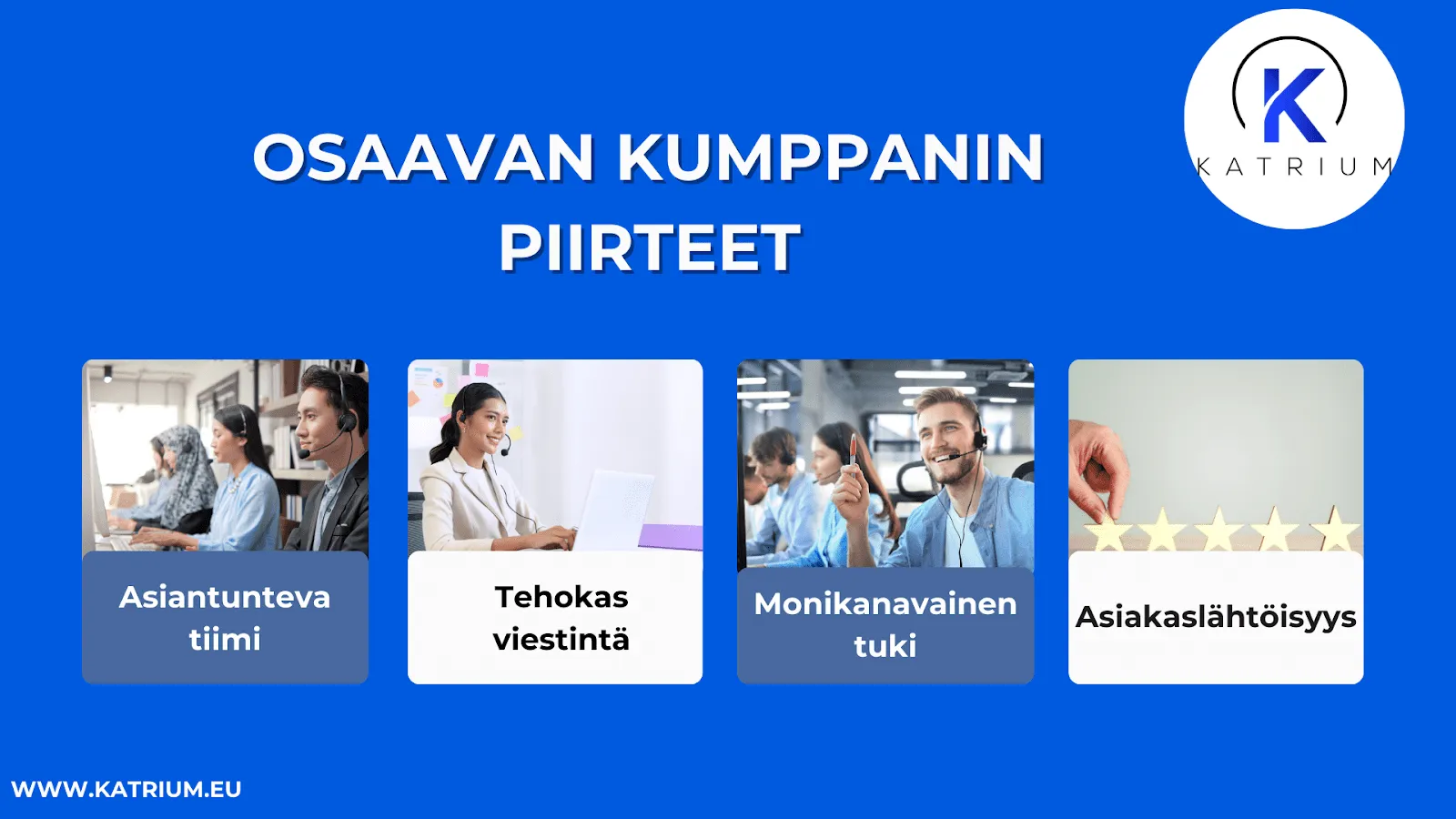 Katrium täyttää nämä kriteerit ja tarjoaa asiakkailleen asiantuntevaa ja asiakaslähtöistä tukea monikanavaisesti. Kumppanina Katrium varmistaa, että asiakaspalvelu on sujuvaa, tehokasta ja asiakasystävällistä.