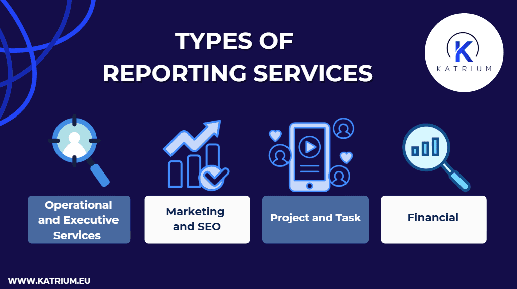 Reporting services entail the collection, presentation, and analysis of business data, including marketing metrics, financial data, operational KPIs, and customer insights. They use structured formats like summaries, visual reports, and dashboards. These reports give business leaders a clear view of performance and trends.